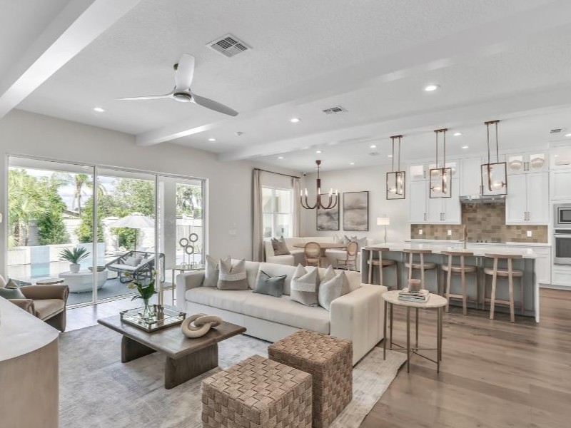 El diseño contemporáneo superior del Liston presenta una entrada acogedora con un porche cubierto que se abre a una amplia gran sala, ofreciendo vistas al encantador comedor y al atractivo lanai cubierto.